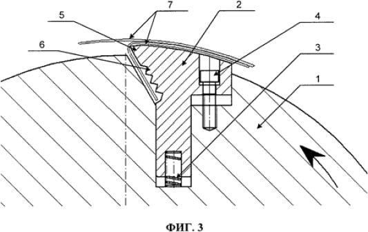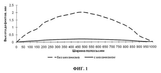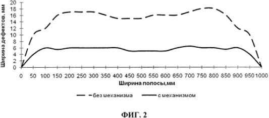 Pic.2 shows a graph of measurements of the width of the prints from the spool. A solid line in pic.2 shows a graph of the width of defects on a roll of material rolled according to the claimed solution. The dotted line shows a graph of the width of defects when rolling a roll of material simply with a slot without using a self-locking mechanism.